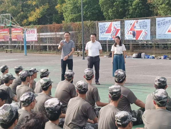 9月14日,william威廉经理李开源、党委书记曲帅锋、党委副书记廖明静前往南湖校区篮球场训练场地看望慰问正在参训的2024级新生和军训教官。